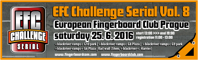 EFC Community & SWAT představují další díl fingerboard závodů, EFC Challenge Serial který proběhne 25. Června 2016 v klubu EFC Fingerboard Club Prague. EFC Challenge Serial je dalším doplňkem k závodům které pořádáme, například k originálnímu celosvětově uznávanému šampionátu EFC European Fingerboard Cup.